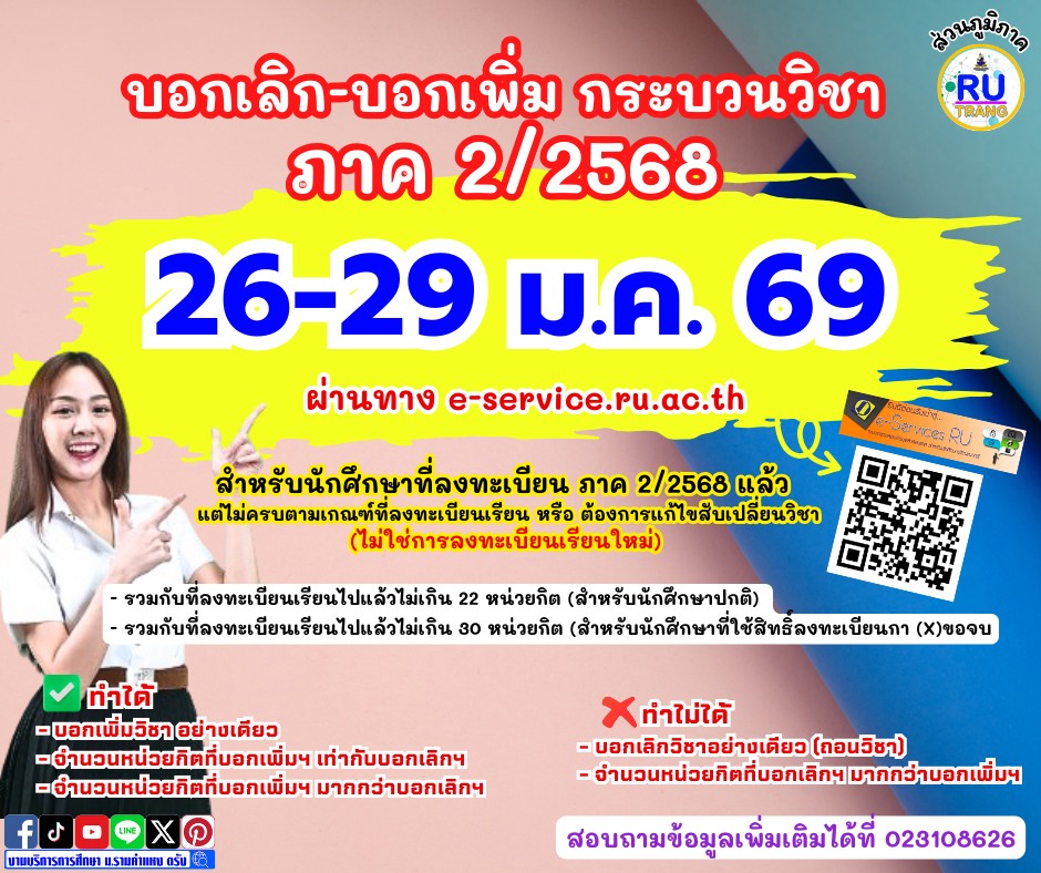 กำหนดบอกเลิก-บอกเพิ่ม กระบวนวิชา ประจำภาค 2 ปีการศึกษา 2568 ในวันที่ 26-29 มกราคม 2569 ผ่านทาง ระบบ e-service https://beta-e-service.ru.ac.th/index.php?r=site/login