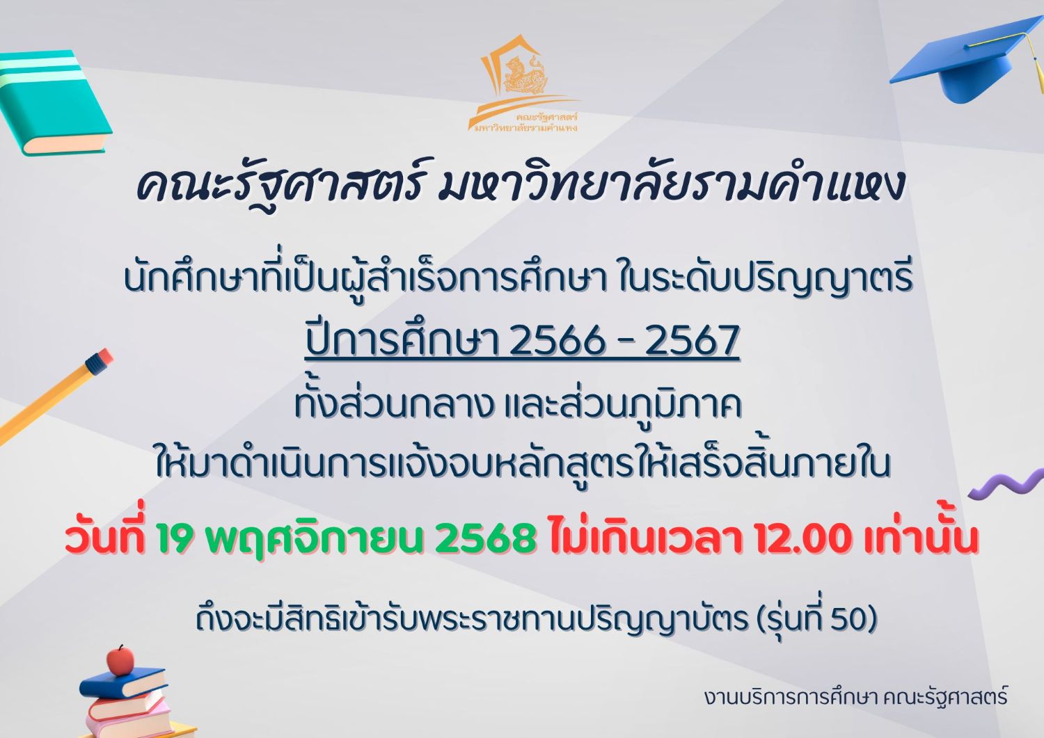 ประกาศสำคัญสำหรับนักศึกษาคณะรัฐศาสตร์ มหาวิทยาลัยรามคำแหง นักศึกษาที่สำเร็จการศึกษาในระดับปริญญาตรี ประจำปีการศึกษา 2566–2567 ทั้งส่วนกลางและส่วนภูมิภาค โปรดดำเนินการ แจ้งจบหลักสูตร ให้เสร็จสิ้นภายใน วันพุธที่ 19 พฤศจิกายน 2568 เวลาไม่เกิน 12.00 น.