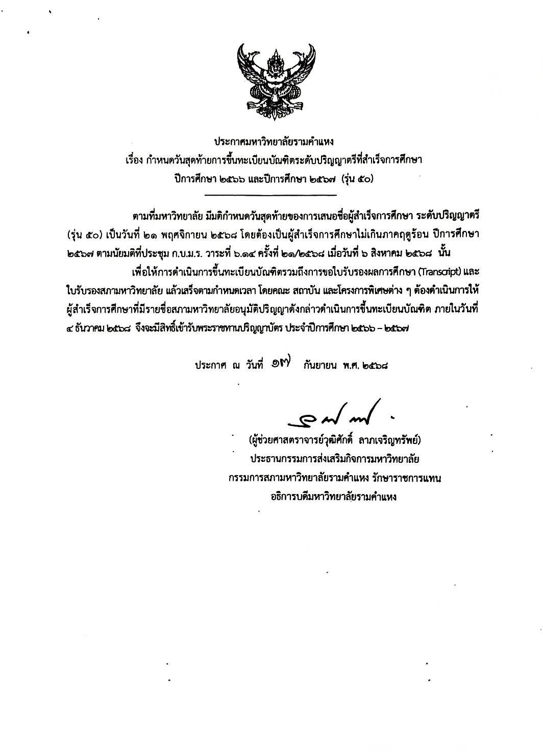 -ผู้ที่ดำเนินการภายในกำหนด จะมีสิทธิ์เข้าพระราชทานปริญญาบัตรรุ่นที่ 50 ของมหาวิทยาลัยรามคำแหง