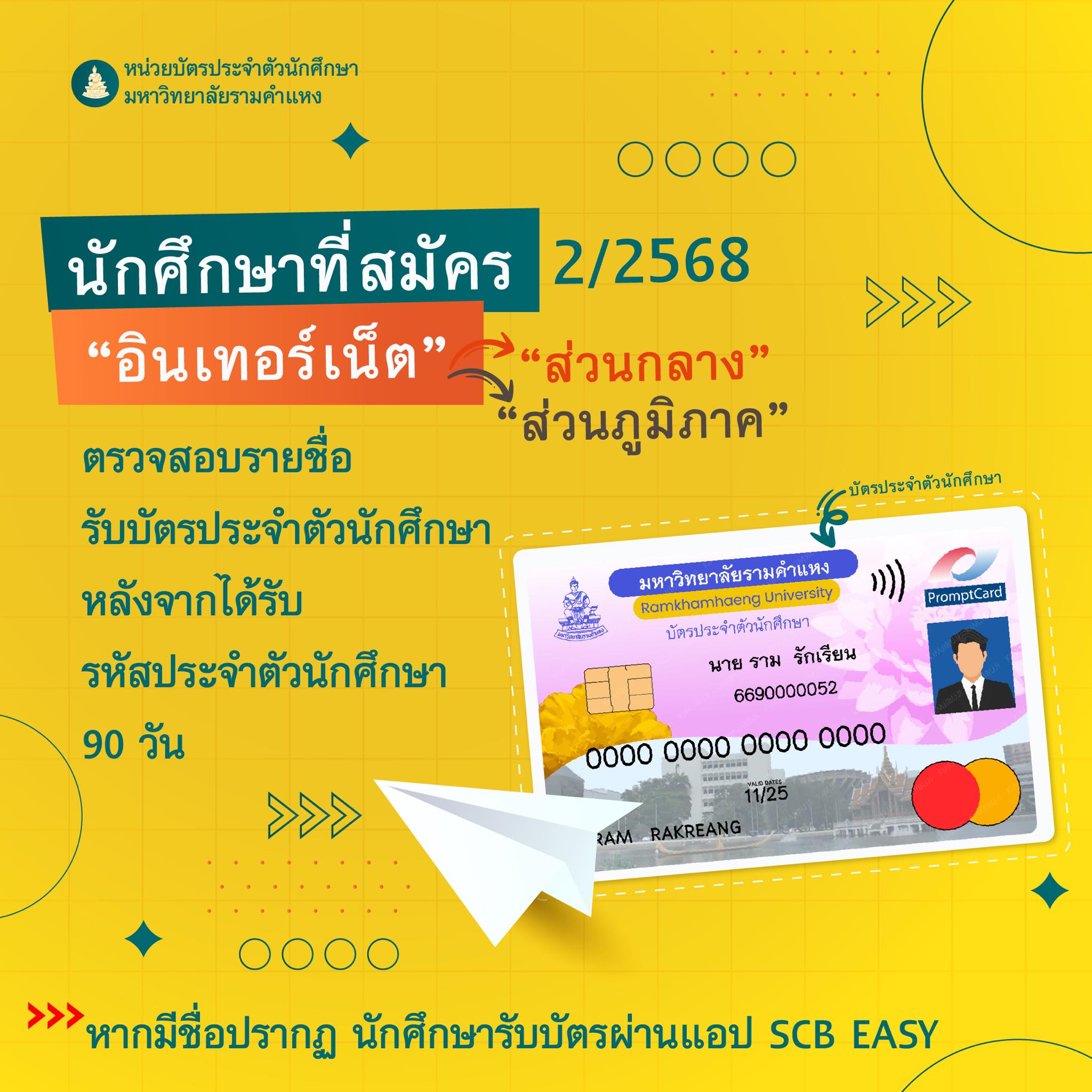 การรับบัตรประจำตัวนักศึกษาสำหรับนักศึกษาที่สมัครเรียน ภาคเรียนที่ 2 ปีการศึกษา 2568 ทางอินเทอร์เน็ต ส่วนกลาง และส่วนภูมิภาค