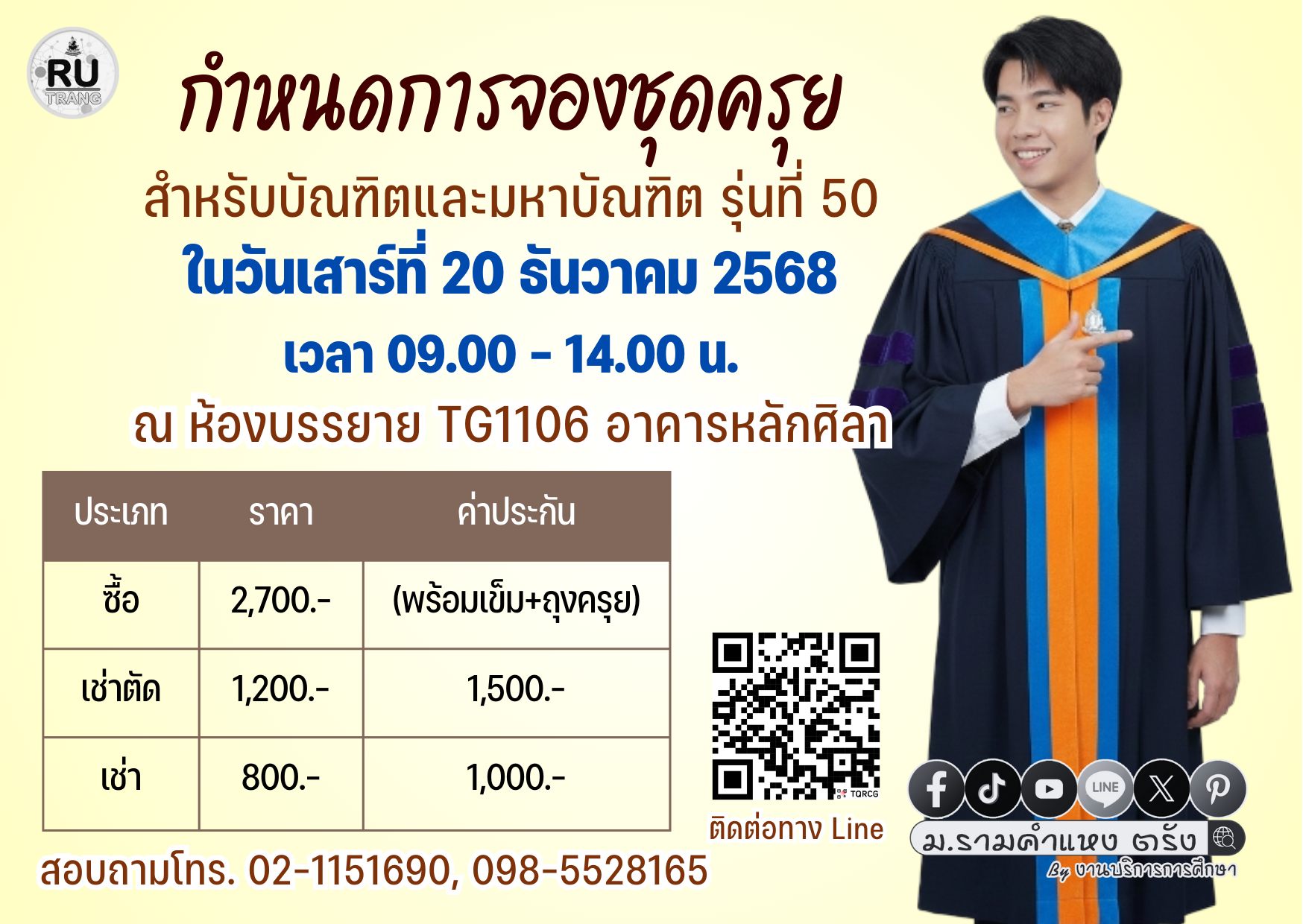 กำหนดการจองชุดครุย รุ่นที่ 50 ในวันเสาร์ที่ 20 ธันวาคม 2568 เวลา 09.00-14.00 น.