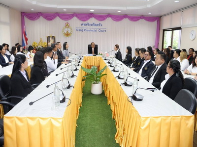 วันพฤหัสบดีที่ 25 กันยายน 2568 มหาวิทยาลัยรามคำแหง สาขาวิทยบริการเฉลิมพระเกียรติ จังหวัดตรัง จัดกิจกรรมศึกษาดูงาน ณ ศาลจังหวัดตรัง สำหรับนักศึกษาระดับปริญญาตรี คณะนิติศาสตร์ เพื่อเสริมสร้างความรู้ วิสัยทัศน์ และประสบการณ์เชิงวิชาชีพ โดยนักศึกษาได้เรียนรู้จากสถานที่จริง พร้อมทั้งทำความเข้าใจเกี่ยวกับกระบวนการพิจารณาคดีในระบบกฎหมายไทยอย่างลึกซึ้ง ผ่านบรรยากาศการเรียนรู้เชิงประจักษ์ โดยมี ผู้ช่วยศาสตราจารย์กนกวรรณศ์ ศรัทธากุลทรัพย์ รองอธิการบดีฝ่ายวิทยบริการจังหวัดตรัง พร้อมด้วยนักศึกษา และบุคลากรสาขาวิทยบริการฯ จังหวัดตรัง จำนวน 45 คน เข้าร่วมศึกษาดูงาน และมี นายพีรวุฒิ เอ่งฉ้วน ผู้พิพากษาหัวหน้าศาลจังหวัดตรัง นางสาวมณีนุช แสงสุวรรณนุกูล ผู้พิพากษาศาลจังหวัดตรัง และนายวรพัทธ์ ปานแก้ว ผู้อำนวยการสำนักอำนวยการประจำศาลจังหวัดตรัง พร้อมคณะผู้พิพากษา ข้าราชการศาลยุติธรรม/บุคลากร ศาลจังหวัดตรัง ให้การต้อนรับ