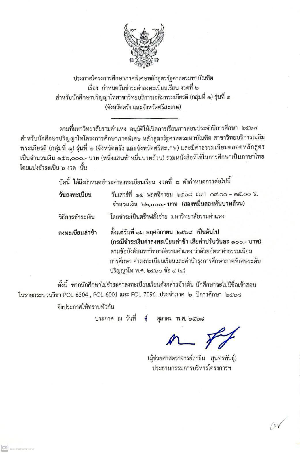 ประกาศโครงการศึกษาภาคพิเศษหลักสูตรรัฐศาสตรมหาบัณฑิต เรื่อง กำหนดวันชำระค่าลงทะเบียนเรียน งวดที่ 6